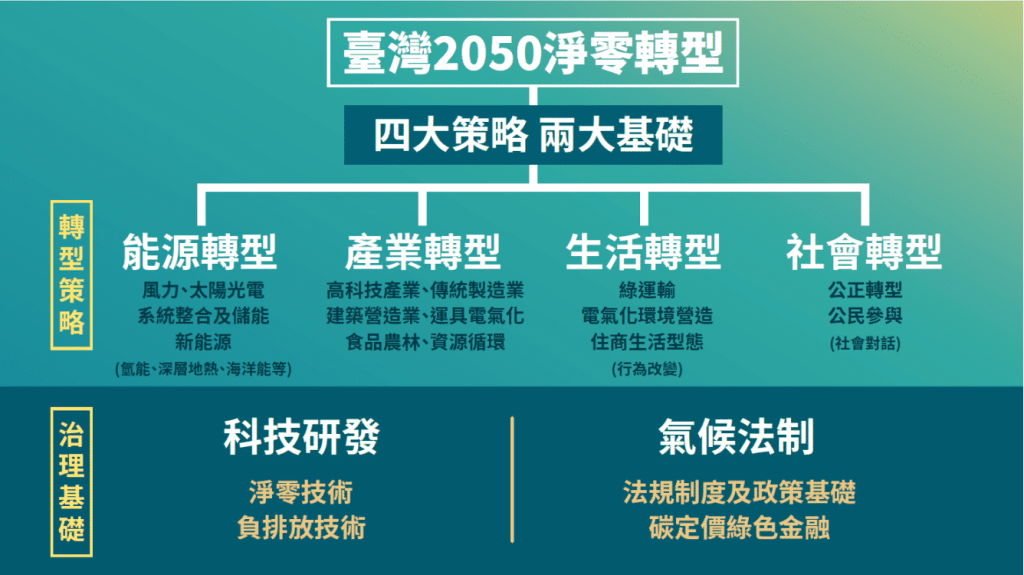 分別為以發展淨零技術與負排放技術的「科技研發」,和擬定法規制度及政策基礎、碳定價綠色金融的「氣候法制」。