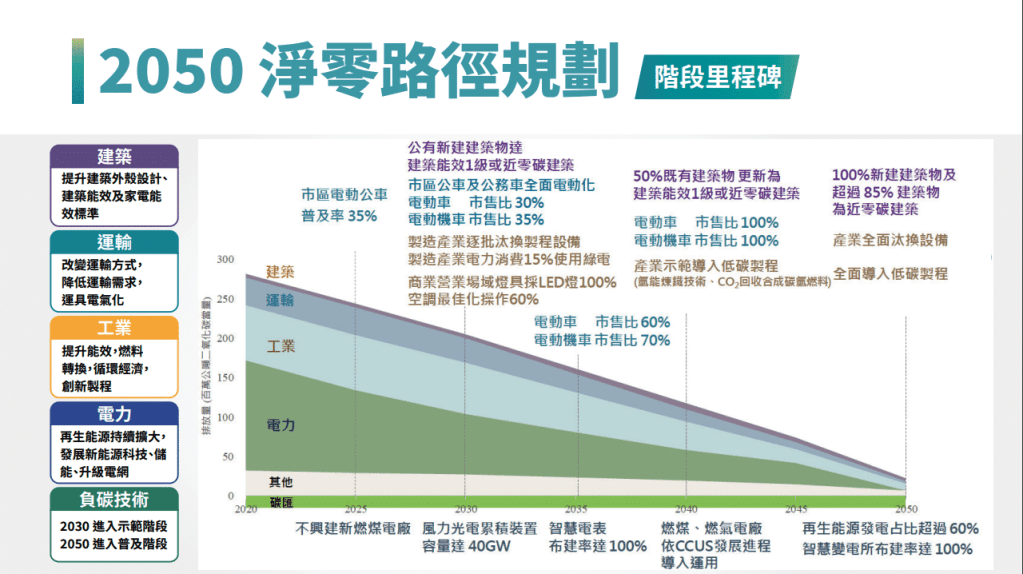 根據前面所說的兩階段,為實現淨零排放台灣於111年3月公布「台灣2050淨零排放路徑及策略總說明」,其中也公佈了2050淨零碳排路徑圖: